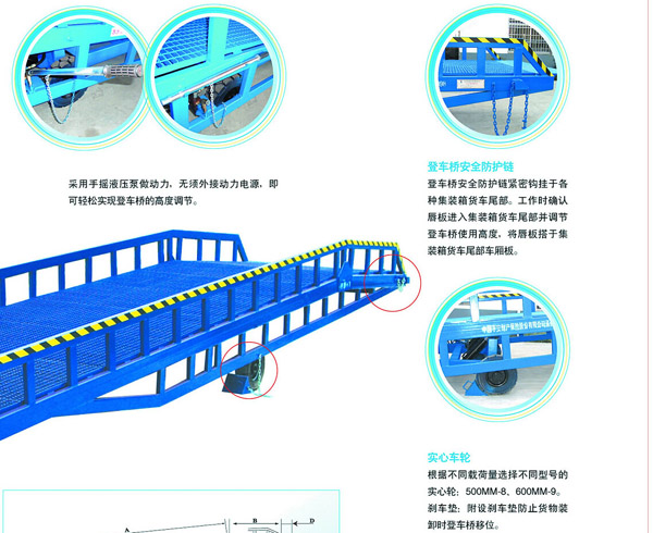 移動式登車橋是與叉車配合使用的貨物裝卸輔助設(shè)備,可根據(jù)貨車車廂的高低調(diào)節(jié)高度,叉車可以直接通過本設(shè)備駛?cè)胲噹麅?nèi)部進行貨物的批量裝卸,僅需單人作業(yè),即可實現(xiàn)貨物的快速裝卸。它的菱形網(wǎng)狀結(jié)構(gòu),充分保證了卓越的防滑性能,使叉車有極好的爬坡性和可操縱性。即使在雨、雪天氣,仍能保證正常使用。它的可調(diào)節(jié)長度的索鏈能方便地鉤住貨車,使登車橋與貨車始終緊密貼合。采用手搖液壓泵作動力,不需外接動力電源即可輕松實現(xiàn)登車橋的高度調(diào)節(jié)。配置的剎車墊可有效防止貨車裝卸時登車橋移位。